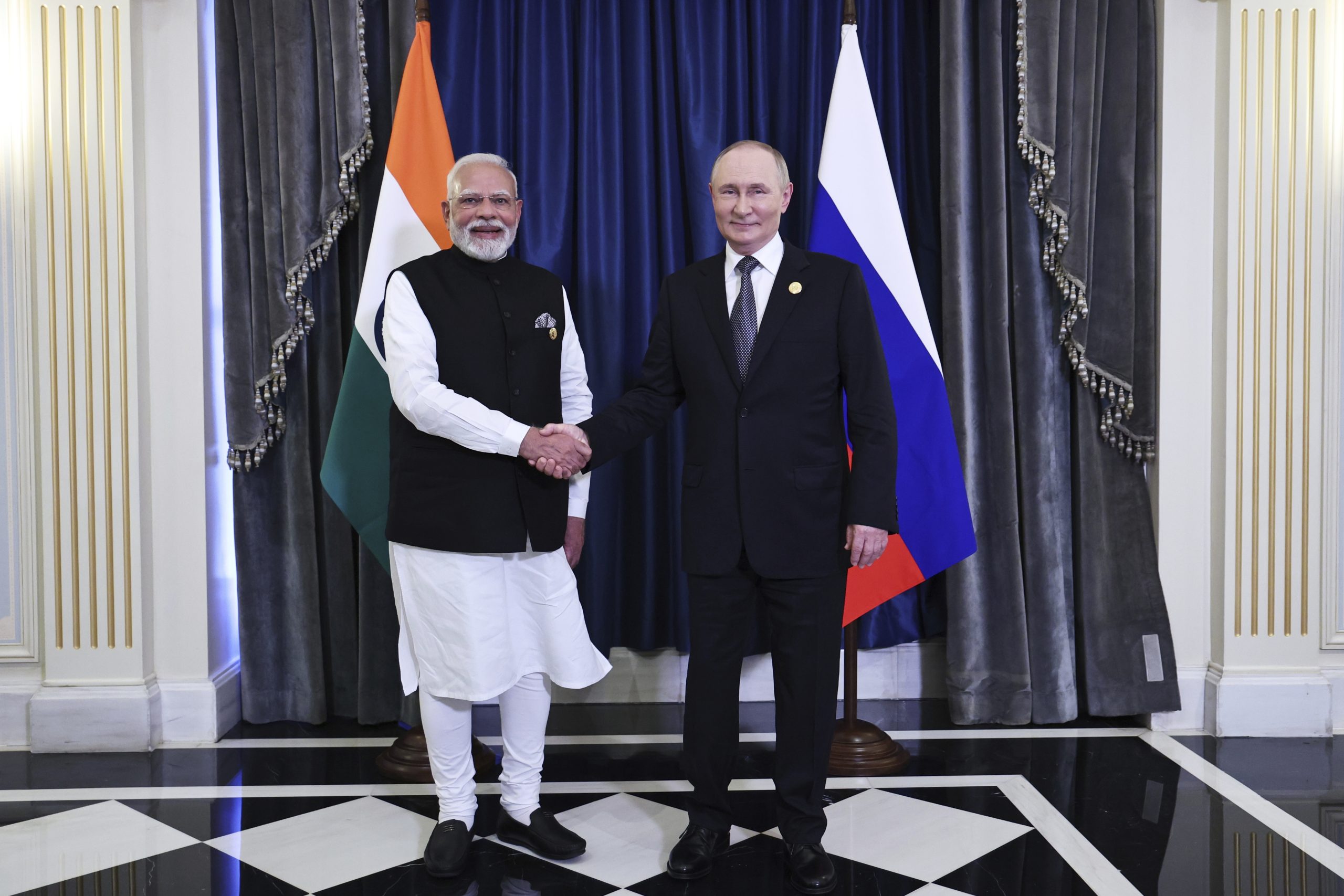 Ο Ρώσος πρόεδρος Βλαντίμιρ Πούτιν και ο Ινδός πρωθυπουργός Ναρέντρα Μόντι κατά τη διάρκεια της…
